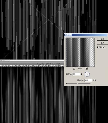 5.下面我们来调整下水平方向图层的大小。你可以用编辑-自由变化-缩放,或者按CTRL+T快捷键命令。之后执行滤镜-模糊-动感模糊。设置角度为90度距离为155像素,如下图所示: