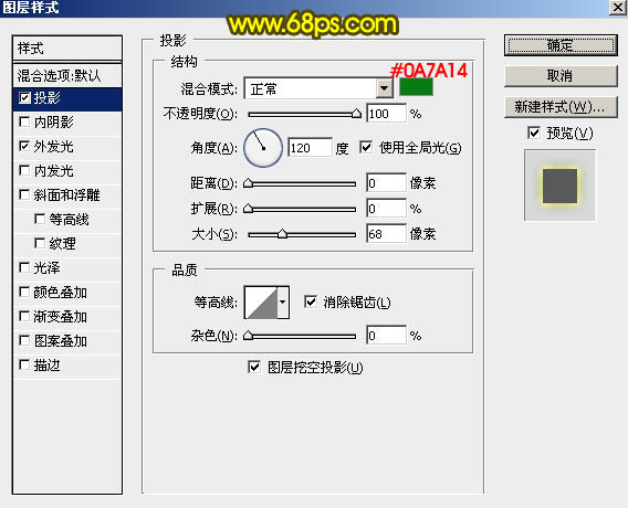 20、双击图层面板,当前图层缩略图载入图层样式,设置:投影,外发光,参数及效果如下图。