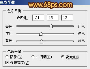 12、创建色彩平衡调整图层,对高光进行调整,参数及效果如下图。