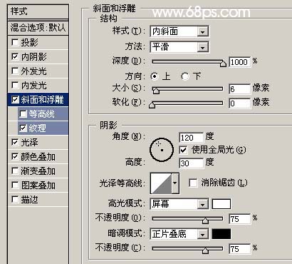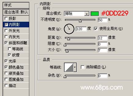 3.新建一个空白图层,然后把加上样式的图层跟空白图层合并,再双击合并后的图层,调出图层样式,参数设置如图6-11,效果如图12