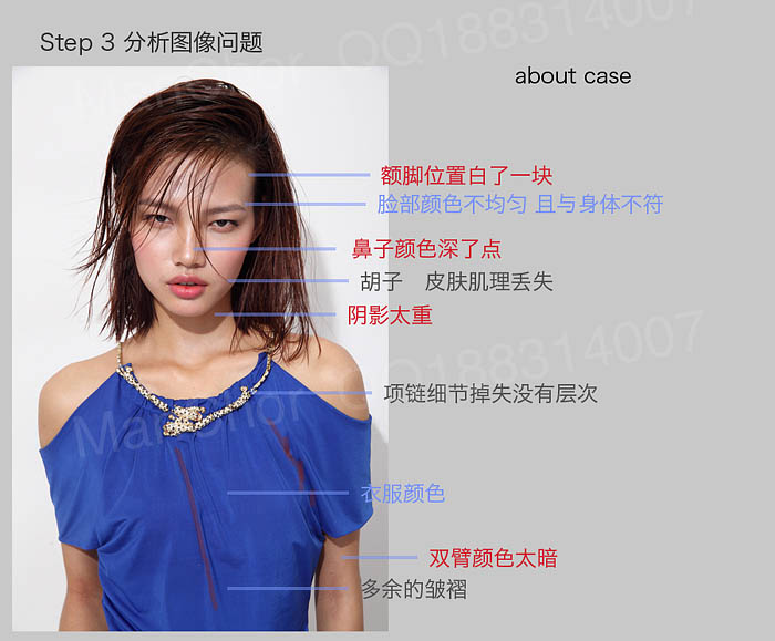 2、修去瑕疵,在这个过程中,你要观察图像的问题,包括颜色是否均匀,皮肤质感等。