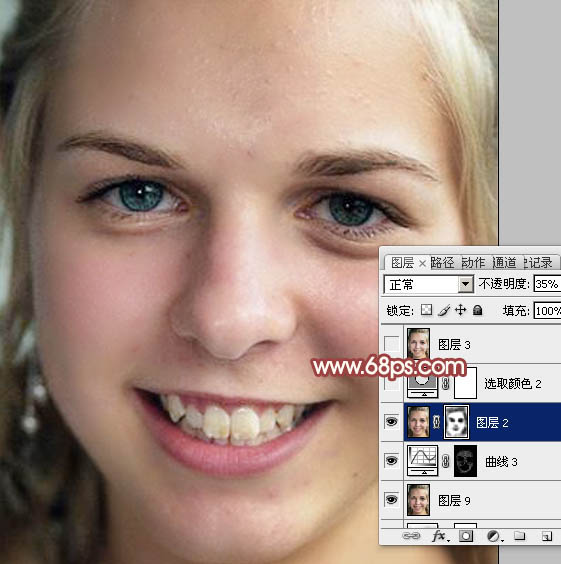 15、把图层不透明度改为:35%,添加图层蒙版,用黑色画笔把五官及脸部以外的部分擦出来,效果如下图。这一步把斑点适当柔化处理。
