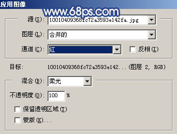 + Alt + Shift + E 盖印图层。执行:图像 > 应用图像,参数设置如图2,效果如图3。