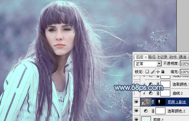 9、把背景图层上面的图层复制一层,按Ctrl + Shift + ] 置顶,按住Alt键添加图层蒙版,用白色画笔把人物脸部及肤色部分擦出来,如下图。