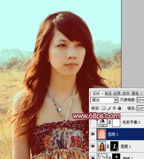 8、按Ctrl + Alt + 2 调出高光选区,新建一个图层填充橙红色:#FD7227,混合模式改为“柔光”,不透明度改为:20%,效果如下图。这一步增加图片高光部分的暖色。