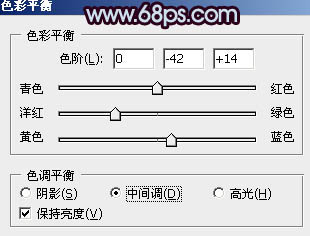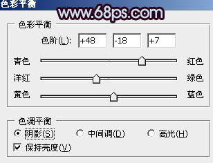 3、在背景图层上面创建色彩平衡调整图层,对阴影进行调整,参数设置如图2,效果如图4。这一步调整湖水的颜色。