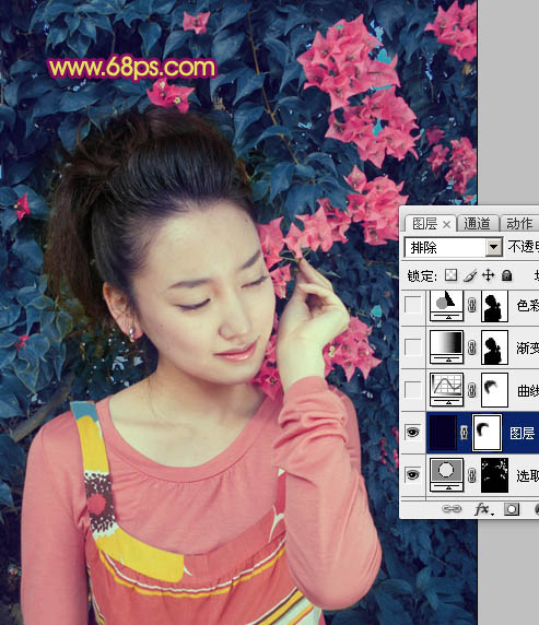 5、新建一个图层填充深蓝色:#070126,图层混合模式改为“排除”,加上图层蒙版,用黑色画笔把人物头发部分擦出来,如下图。