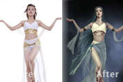 我们要检查它的不足之处。在画面中,图片的整体格局非常不错。适度的灰度也给了我们更多的调整空间。画面的主要问题在于天空的景致冲击力不够强,铁链也影响了画面的美感。2、修饰掉画面中的铁链部分后,观察整体光感,感觉婚纱的质感不是很顺滑,所以对它进行了修饰(修饰画面的顺滑可用的工具有很多,首选的话还是仿制图章,最好结合光影擦