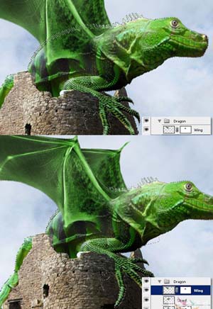 25、现在我们要为龙画上一些影子效果,参考第18步,进入原始的文件夹(即图层组),按住ctrl在“蜥蜴”图层的缩略图上点击,然后按住shift键,按下ctrl点击“翅膀”图层,然后点击ctrl+shift+I即可。