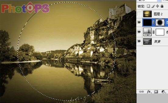 2.新建一层填充黑色不透明度改为50,然后添加蒙版羽化80,然后反选填充黑色。
