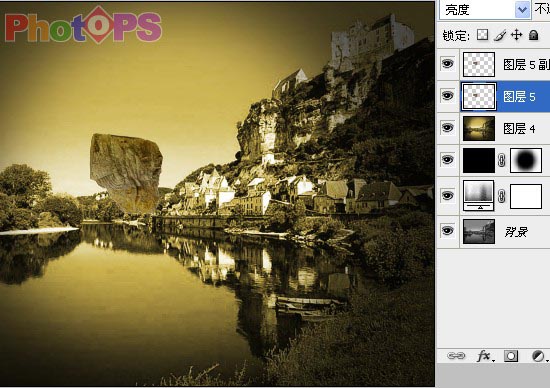 4.抠取石头然后放入风景图中复制1层,图层五改为亮度,图层5副本改为柔光(效果如图):