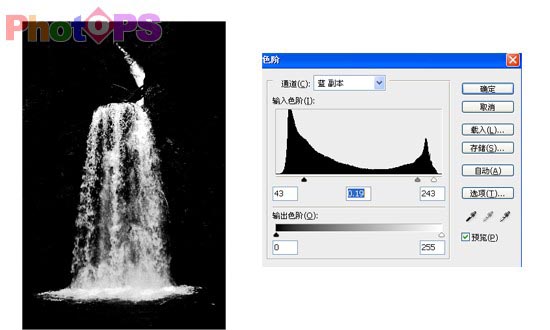 9.打开瀑布图,对瀑布的蓝通道进行调整参数分别是43