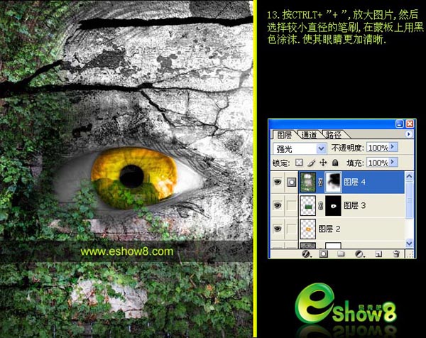 作者合成图片的方法非常细腻,过程:先合成一幅教暗的背景图片;再加入鹿,并用火焰素材给鹿角部分增加火焰;再根据光源位置,给鹿局部及地面部分增加火焰反光即可。最终效果