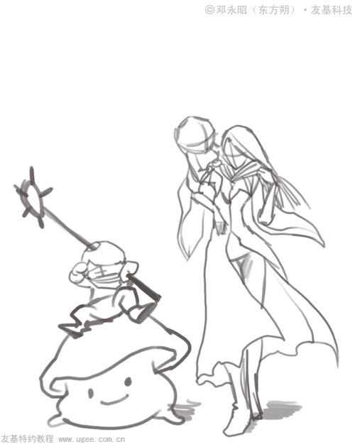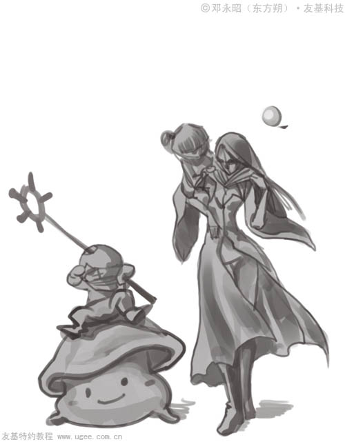 2、这次我的基本构思是一个光明系的法师MM带着她的两个小朋友一起出游时的情景,小女孩撒娇地坐在法师MM的肩上,小男孩则坐在蘑菇坐骑上开心地行走。