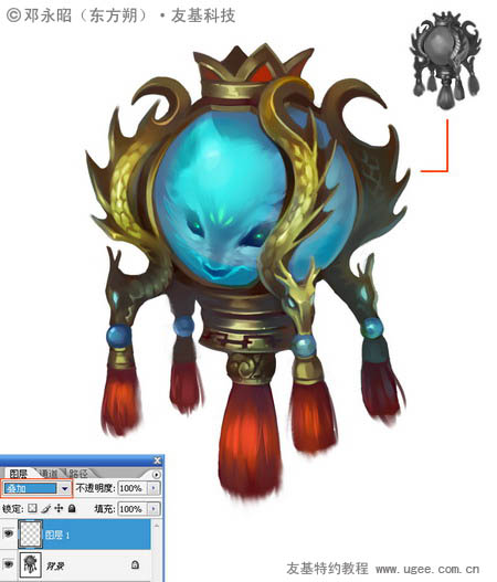 9、灯笼的黑白效果图基本完成,现在新建一层,用“叠加”的方式给灯笼上色。