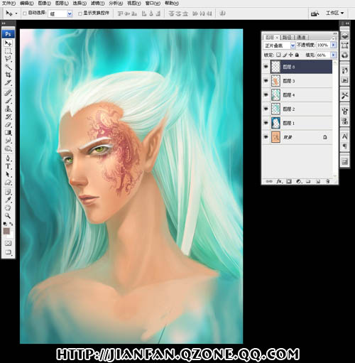 38、在刺青层的上面新建一层,在头额上加了痣,还有把前额的头发和剩下的图发都画完。这样人物就基本完成。