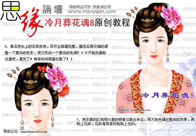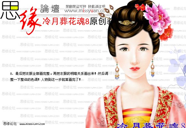 6、最后把头上的花盒发饰,耳环全部画完整,画完后再仔细的调整一下整体的色彩,使他形成一个整体的色调。