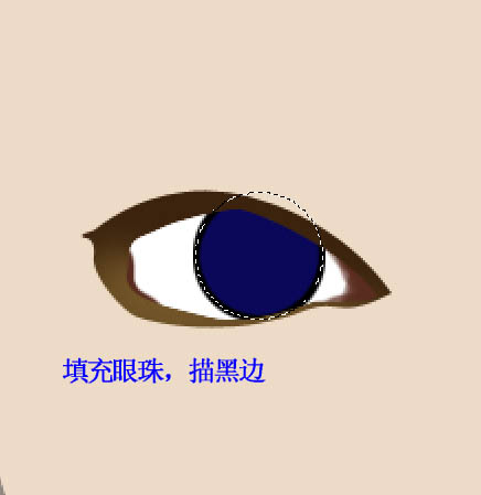 5、新建一个图层,用椭圆选框工具拉出眼珠选区,填充深蓝色,再描边黑色。