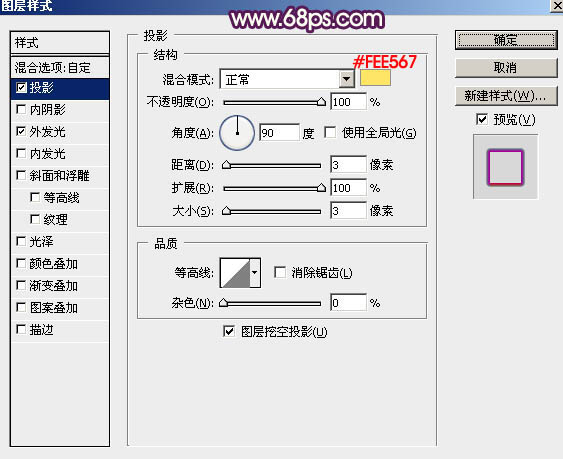 投影:混合模式“正常”,颜色为橙黄色:#fee567,其它设置如下图。
