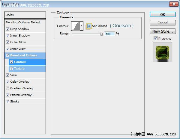 等高线:选择高斯轮廓,勾选“消除锯齿”,并设置范围为100。