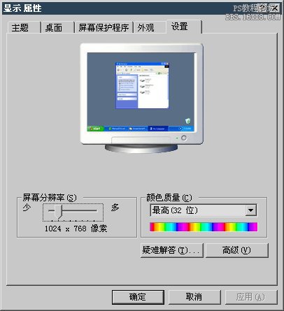 我们的显示器也是点阵式的,前一课中看过的电视机屏幕,就是由许多的点构成的。包括液晶屏和等离子屏也是如此。 传统的显像管显示器又称为CRT(学名阴极射线管),是显示设备中最早也最普及的种类。 显示器的点阵数是可变的,我们可以从Windows控制调板中的显示项目来查看或改动目前显示器的屏幕分辨率,如下图所示,目前为1024×768像素,也就是说现在显示器横方向能够显示1024个 像素点,竖方向768个像素点。