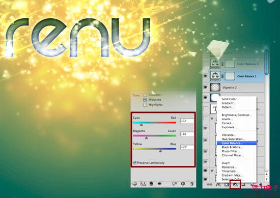 21、点击图层面板上的“下图红框的位置”图标创建一个新的色彩平衡调整层。青色