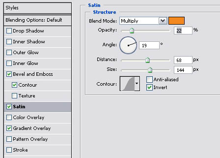 8、现在应用光泽。这将使文本有一些深度,而不只是固体或简单的倾斜。更改颜色为#F3881F。