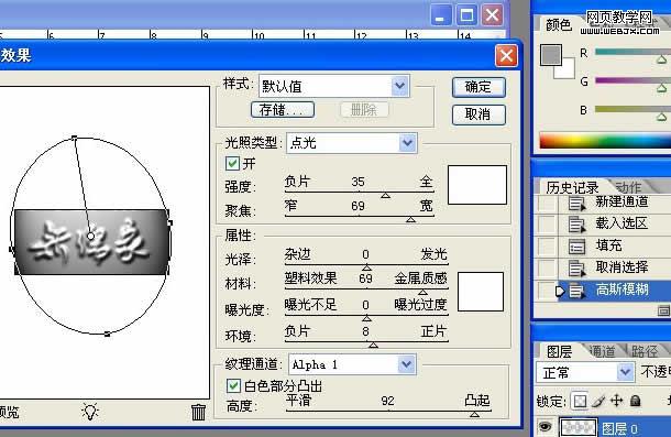 滤镜 > 渲染 > 光照效果,在(纹理通道)中先择Alpha通道,在下边高度和凹起右移动滑块达到90以上就可以,参数设置如下图。