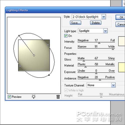 18、在粉红图层之上新建一个图层,填充整个为白色,然后使用滤镜>渲染>灯光效果。作者并不是经常使用灯光效果,但其中的2点钟聚光(Two