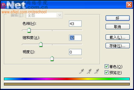 10、执行菜单栏中的“图像”“调整”“色相/饱和度”命令,在弹出的“色相/饱和度”对话框中勾选着色选项,在设置参数如图14所示,单击确定按钮后文字效果如图15所示。