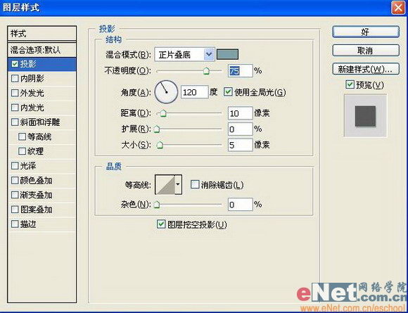 8、双击该图层,添加图层样式,“投影”“斜面和浮雕”设置参数如图31-32所示,图像效果如图33所示。