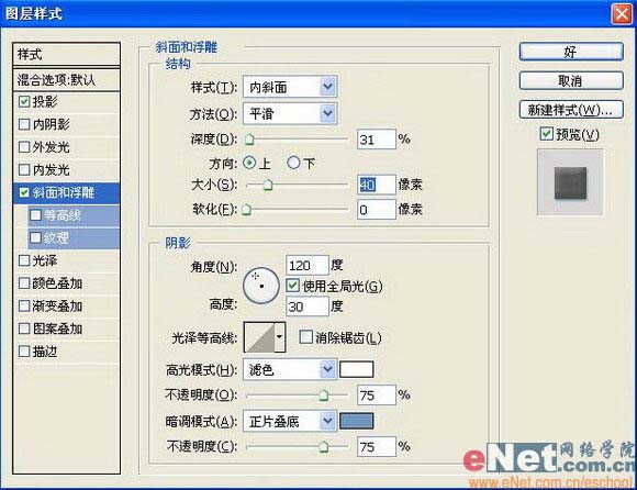 “斜面和浮雕”图层样式,设置参数如图32: