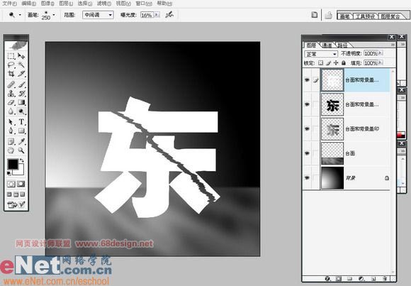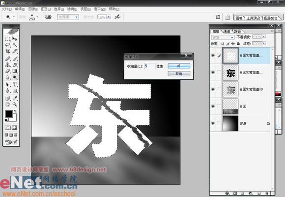 十一、载入“东”的选区,收缩一定量的像素后,清除两个盖印复制层中内容。