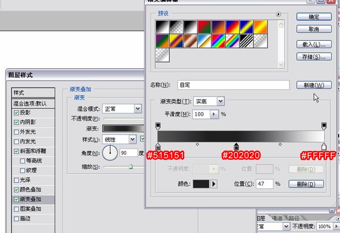 14、渐变颜色的第一个颜色标记点是:#515151,第二个是:#202020,第三个是: