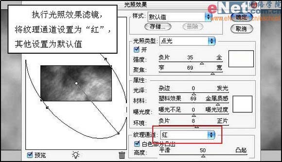 3、执行光照效果滤镜,将纹理通道设置为“红”,其他设置为默认值。