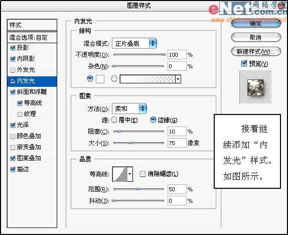 8、接着继续添加“内发光”样式,如图所示。