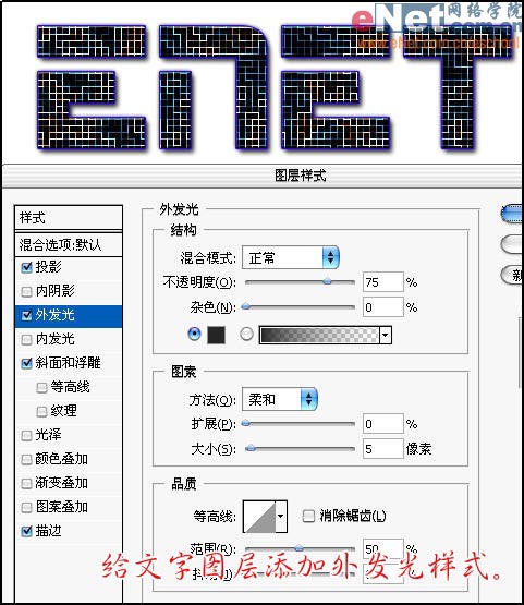 11、给文字图层添加外发光样式。