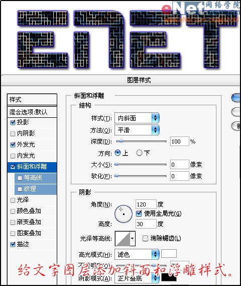 12、给文字图层添加斜面和浮雕样式。