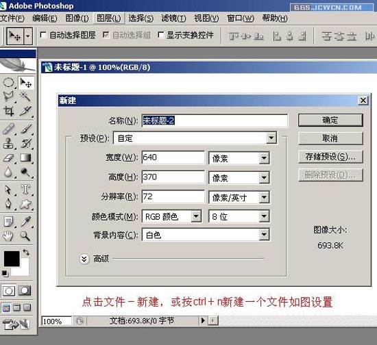 一、点击文件——新建,或按Ctrl+n新建一个文件如图设置。