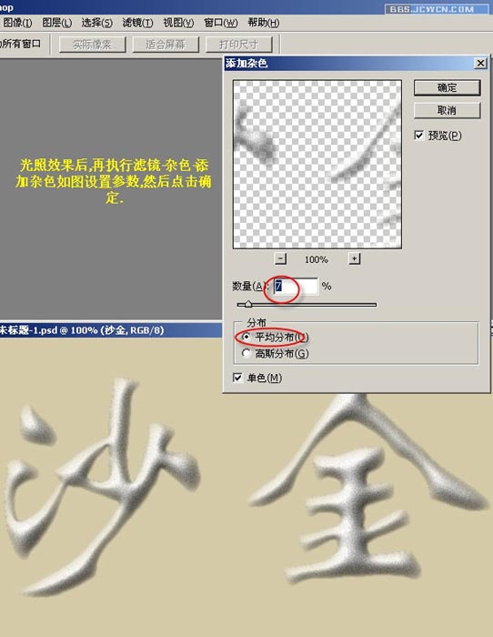 十七、光照效果后,再执行滤镜——杂色——添加杂色,如图设置参数,然后点击确定。