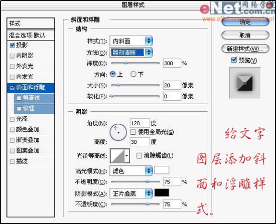 13、给文字图层添加斜面和浮雕样式,设置如图: