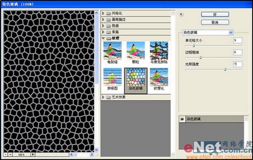 8、新建图层3,填充黑色,执行菜单栏中的“滤镜”“纹理”“染色玻璃”命令,设置参数如图15所示,单击OK,图像效果如图16所示。