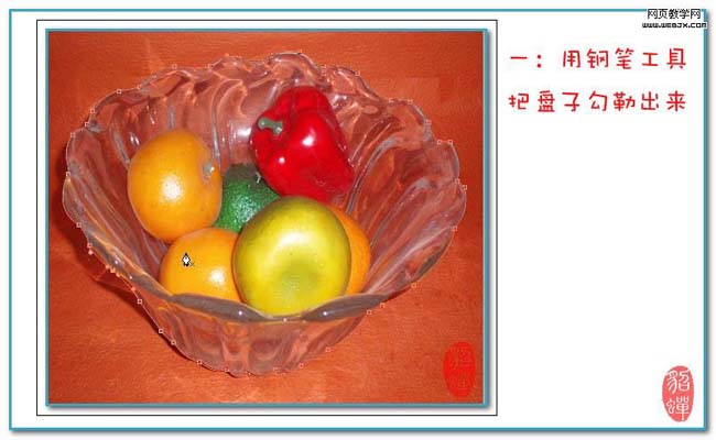 1、打开原图素材,用钢笔工具把盘子勾勒出来。