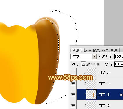 7、新建图层,现在开始从右至左制作甜椒的表面。用钢笔勾出下图所示的选区,填充黄褐色:#844400。