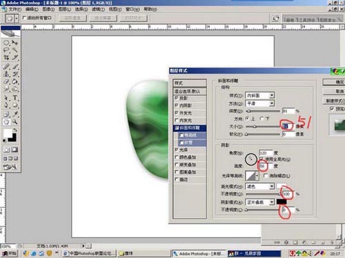 然后调整斜面与浮雕,值的大小自己调整吧。注意红色的51,这个值要看你的石头大小来定,不要死学教程!!!