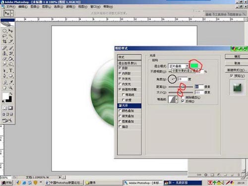 最后一个调整项是光泽,这里要注意选的颜色是同色系较亮较浅的颜色,(例如我前面用的是绿色,这里就选为浅绿色),还有就是要选调距离,再调大小,否则你会看不清楚变化。