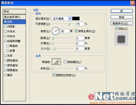 单击“投影”,设置角度为30,距离为3,大小为9,其余默认。