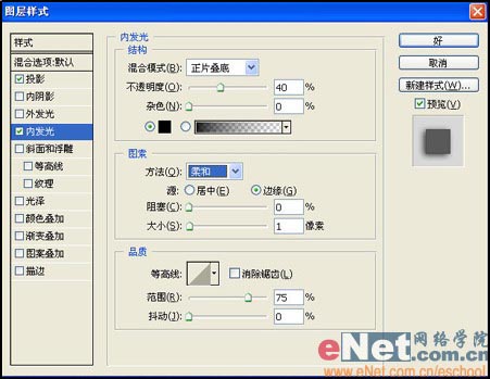 单击“内发光”,设置混合模式为滤色,不透明度为40%,大小为1,其余为默认。