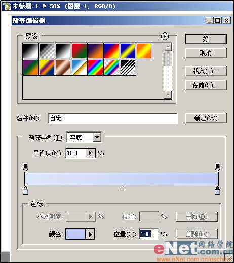 2、选择工具箱中的“渐变工具”,单击其属性栏,进入渐变编辑器中,设置参数如图02所示,其中左边色标的RGB值分别为221、220、248,右边的RGB值为190、194、245,单击确定。