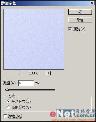 4、取消选择。执行菜单栏中的“滤镜”“杂色”“添加杂色”命令,在弹出的添加杂色对话框中设置参数如图04所示,单击确定按钮后图像效果如图05所示。